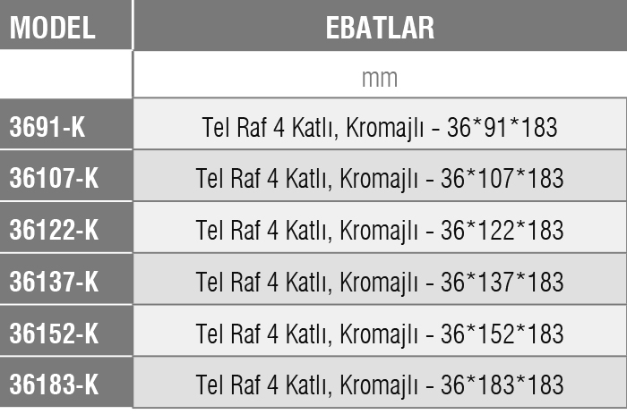 Tel raflar krom kaplama saç malzemeden imal edilmiştir
