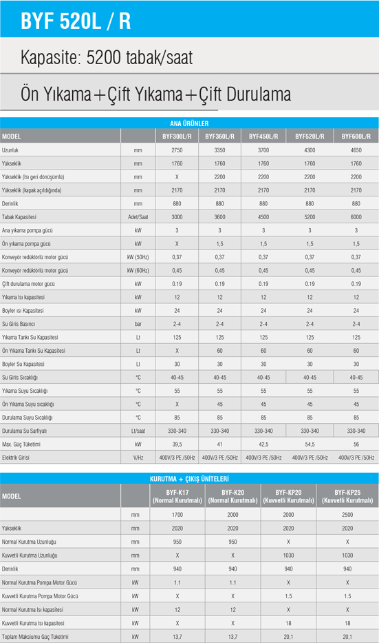 İsteğe bağlı opsiyonel üniteler: Normal Kurutma Ünitesi, Kuvvetli Kurutma Ünitesi, Isı Geri Dönüşüm Ünitesi, Tabldot Yıkama Konveyörü