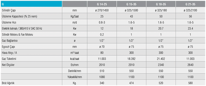 20 Kg/h-60 Kg/h ütüleme kapasitesi (rh %40-50 arası) Ayarlanabilir ütüleme hızı Krom kaplanmış silindir Otomatik cool-devir özelliği Gazlı maddelerde titanyum çelik brülör kullanılmıştır. CE belgeli