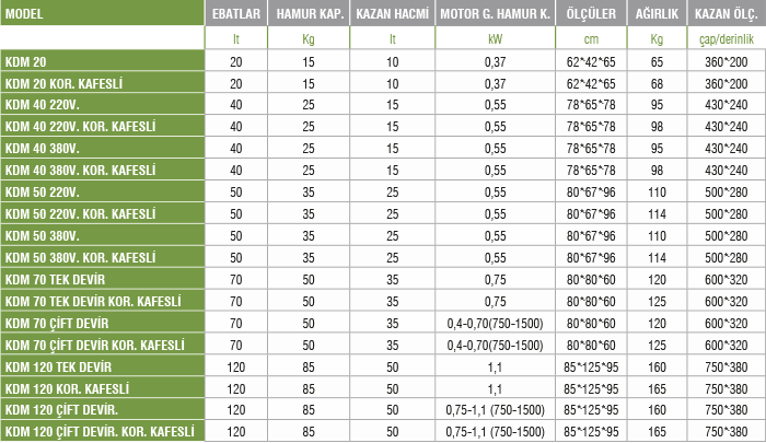 Pizza hamuru, gevrek, börek, yufka vs. bütün mayalı ve ekmek hamurları yoğurmaktadır. Gövde çelikten yapılmış olup elektrostatik fırın boya ile boyanmıştır. Hamur kazanı krom, hamur kancası krom kaplamalıdır.
