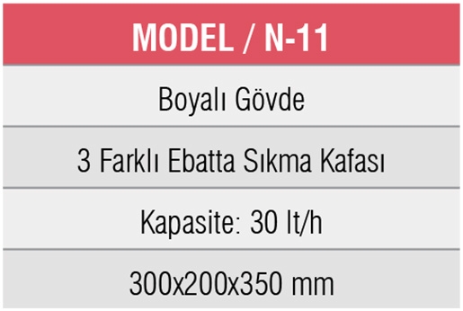 Boyalı Gövde, 3 farklı ebatta sıkma kafası Kapasite: 20-40 litre/saat Ebatlar: 300*200*350 mm Net ağırlık: 10 kg