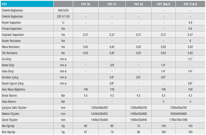 Vakumlu, kollu ve el ütüsü (opsiyonel) Entegre veya merkez buhar bağlantısı Termostat kontrollü üst tabaka ısıtmalı Üst askılık ve aydınlatma