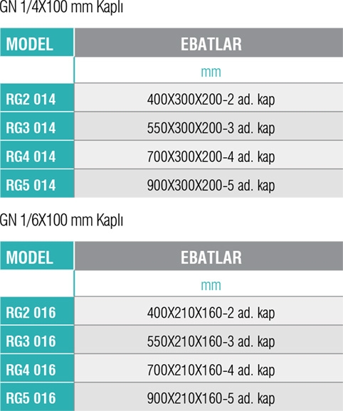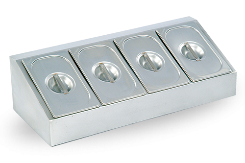 2-3-4-5 kap ve GN1/4*100 mm ya da GN 1/6*100 mm boyutlarında kap tercihleri bulunmaktadır. Tamamı 1,20 mm AISI 304 kalite 18/8 Cr-Nİ paslanmaz çelik saçtan üretilmiştir. Duvara yada tezgah üzerine monte edilebilir.