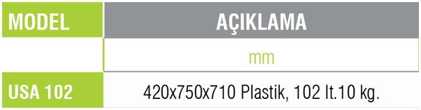 Gövde gıdaya uygun polietilenden, kapaklar polikarbondan üretilmiştir. Kapasite: 102 lt veya 10 kg Ebatlar: 420*750*710 mm